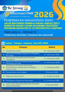 Pengumuman Penerimaan Mahasiswa Baru (PMB) Program Doktor (S3), Magister (S2) dan Spesialis (Sp1) Program Pascasarjana Universitas Lampung Tahun Akademik 2026/2027 untuk pendaftaran belum di buka silakan di cek berkala pada bulan Februari 2026.