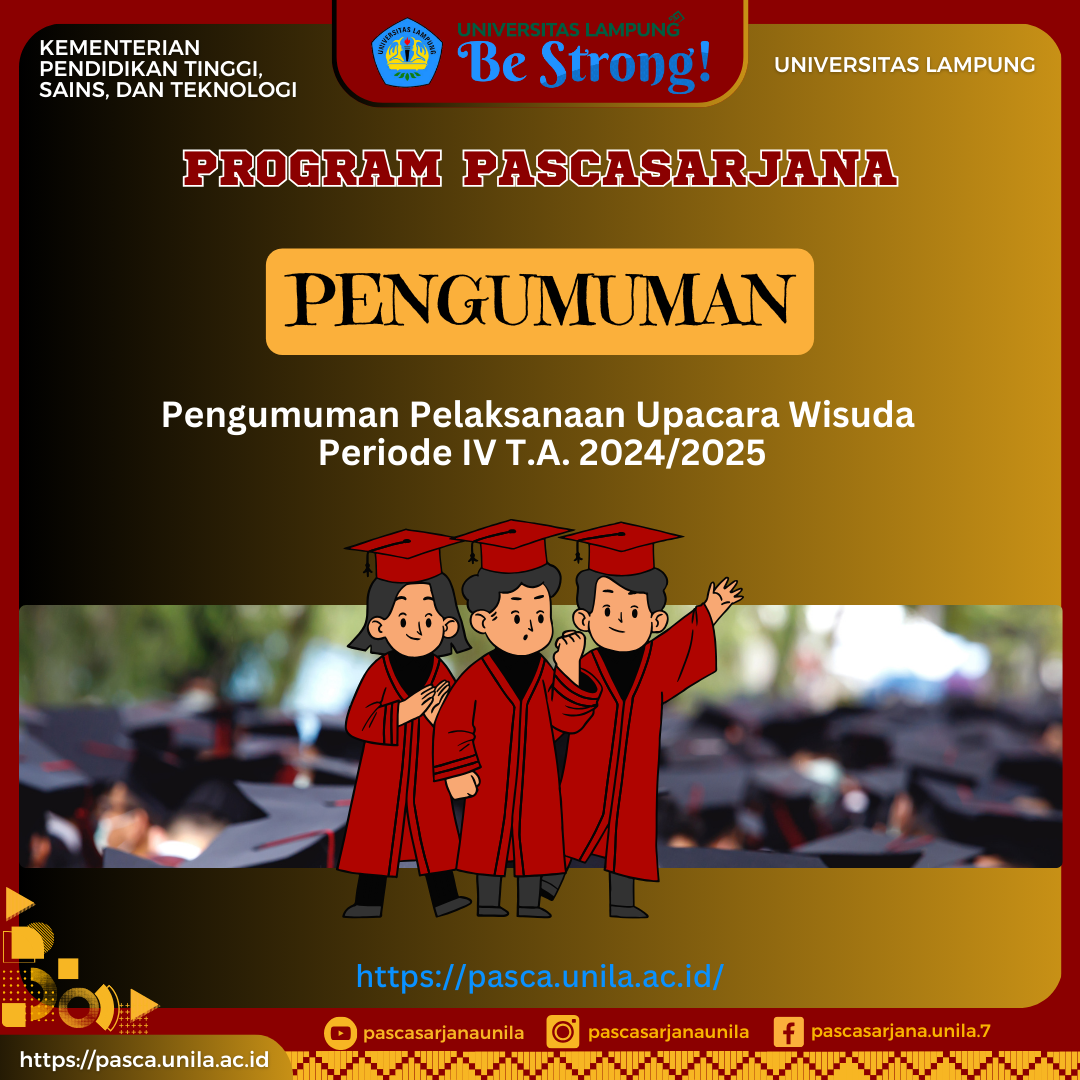 Bersama ini kami informasikan beberapa hal terkait pelaksanaan Wisuda Periode IV Tahun Akademik 2024/2025: 1. Upacara wisuda dilaksanakan secara luring/offline hari Sabtu, tanggal 15 Maret 2025,Pukul 07.30 WIB s.d. Selesai, di Gedung Serba Guna Universitas Lampung.2. Wisudawan wajib mengikuti gladi …