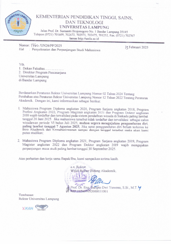INFORMASI PENYELESAIAN DAN PERPANJANGAN STUDI Posted by admin Categories EDARAN Date Februari 13, 2025 Share: admin Previous post Workshop Akselerasi Implementasi Sistem Penjaminan Mutu Internal (SPMI) Menuju Akreditasi Unggul bagi Pengelola Program Studi Pascasarjana Februari 13, 2025 Next post RAPAT KOORDINASI RENCANA PENETAPAN DAYA TAMPUNG PENERIMAANMAHASISWA BARU (PMB) PROGRAM PASCASARJANA UNIVERSITAS LAMPUNGPROGRAM DOKTOR (S3), MAGISTER (S2) DAN SPESIALIS (SP1) T.A. 2025/2026 Februari 17, 2025 You may also like SURAT EDARAN TENTANG JAM KERJA PEGAWAI PADA BULAN RAMADHAN Februari 28, 2025