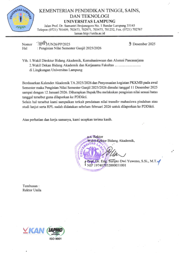 Pengisian Nilai Semester Ganjil Tahun Akademik 2025/2026 Posted by admin Categories PENGUMUMAN Date Desember 9, 2025 Share: admin Previous post Pengumuman : Pengambilan Kartu Tanda Mahasiswa (KTM) Angkatan 2025 Desember 9, 2025 Next post Pengumuman : Pemberitahuan Jadwal Pembayaran Uang Kuliah Semester Genap Tahun Akademik 2025/2026 Januari 5, 2026 You may also like Pengumuman : Pengambilan Kartu Tanda Mahasiswa (KTM) Angkatan 2025 Desember 1, 2025 UPA BK Gelar Workshop Penguatan Layanan Bimbingan Konseling November 27, 2025 Pengumuman : Pembuatan Kartu Tanda Mahasiswa (KTM) Mahasiswa Baru Program Doktor, Magister dan Spesialis Angkatan 2025 September 11, 2025