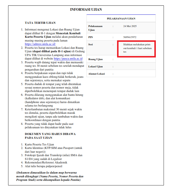 - Informasi mengenai Lokasi dan Ruang Ujian dapat dilihat H-1 dengan Mencetak Kembali Kartu Peserta Ujian melalui akun pendaftaran masing-masing peserta pada laman https://admisi.unila.ac.id/ dan peserta hadir 30 menit sebelum jadwal ujian berlangsung.